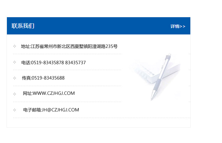 傳真:0519-83435688    郵編:213135    網址:WWW.czjhgj_com.zgcshzs.com    電子郵箱:JH@czjhgj_com.zgcshzs.com